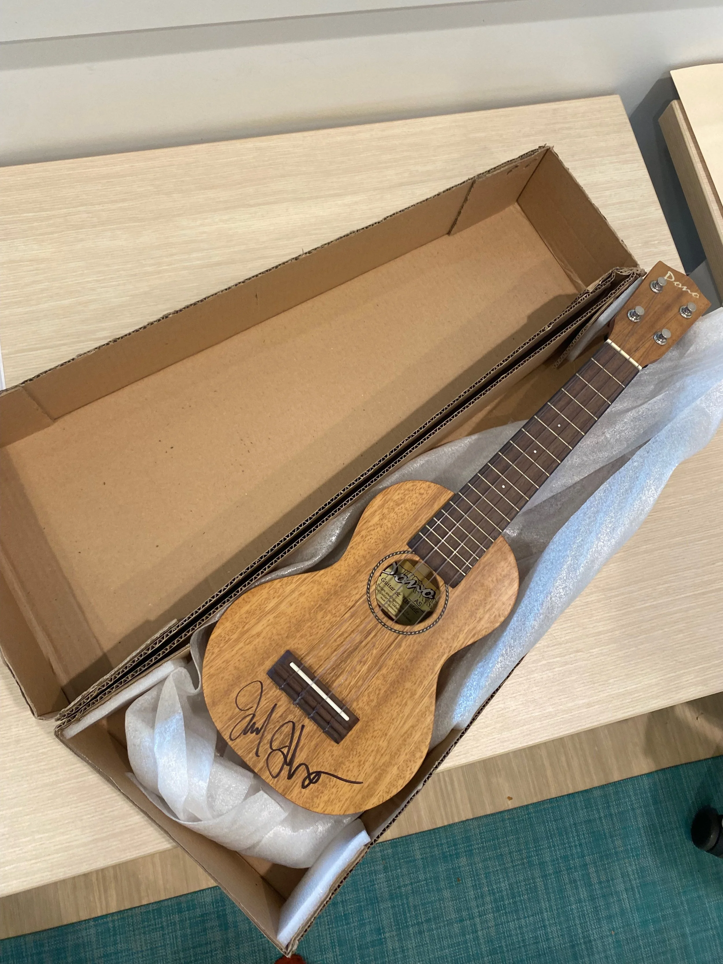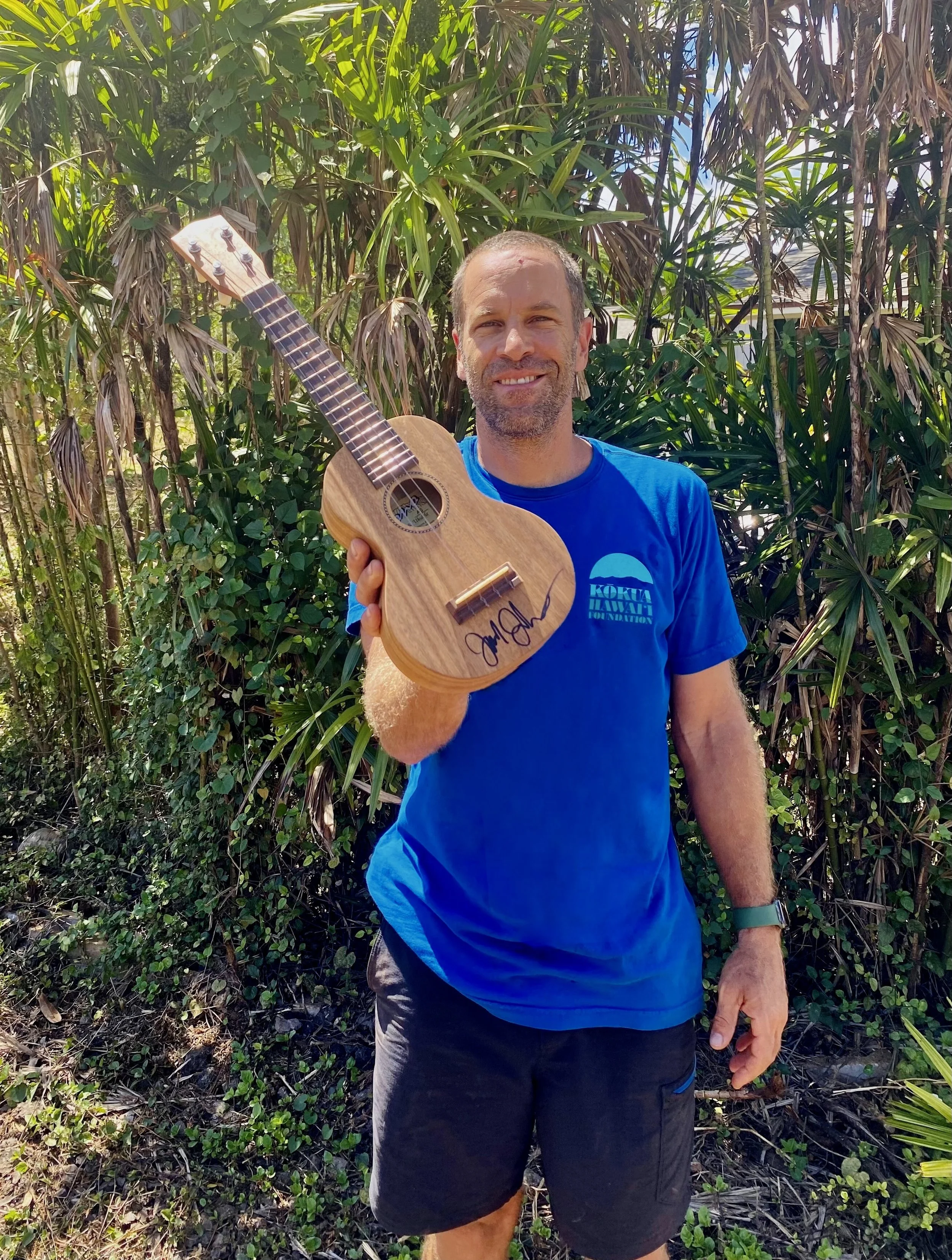 A Pono ukulele signed by Jack Johnson, the singer-songwriter and musician. This Ukulele was a part of a fundraising effort to support wildfire relief efforts in Maui.