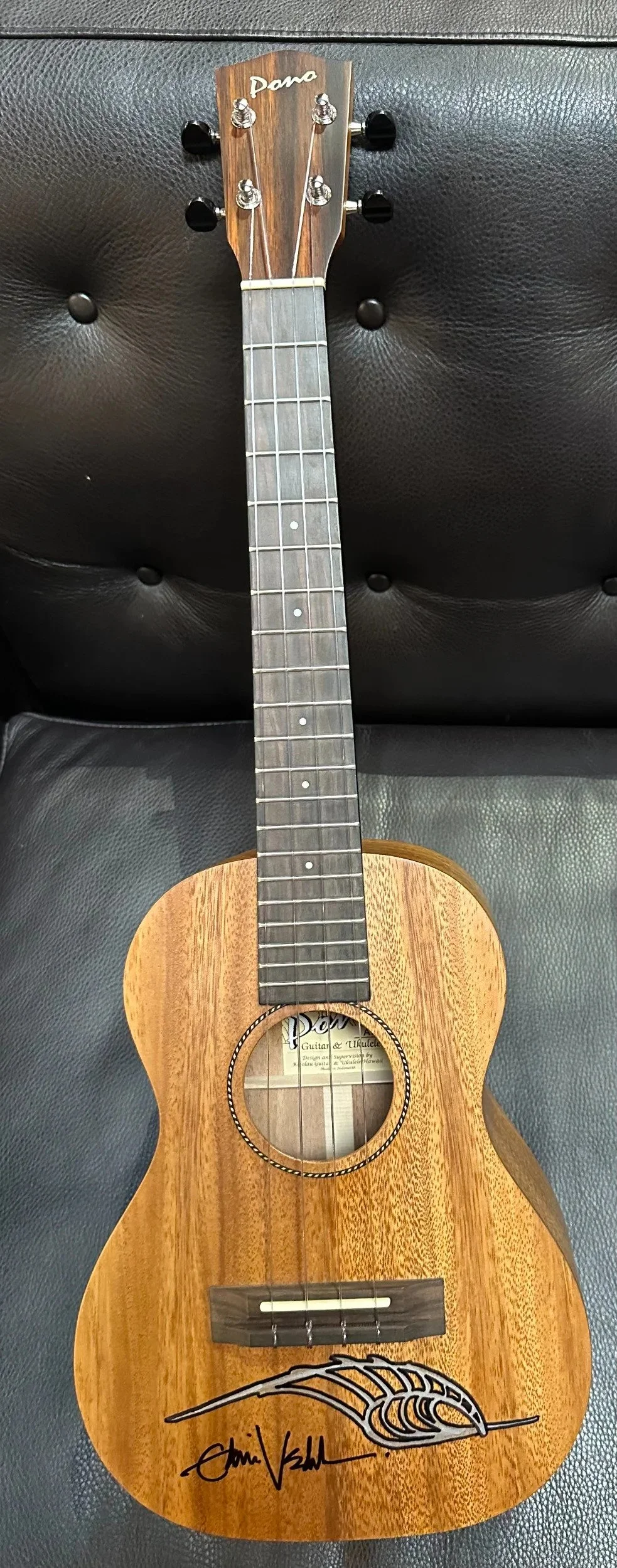 A Pono ukulele signed by Eddie Vedder, the lead singer of Pearl Jam. This ukulele was part of a fundraising effort to support wildfire relief efforts in Maui.